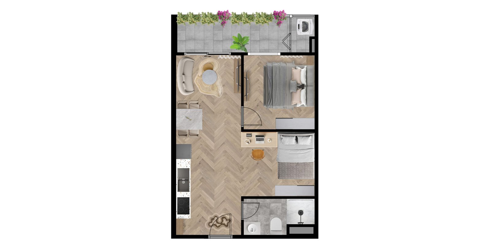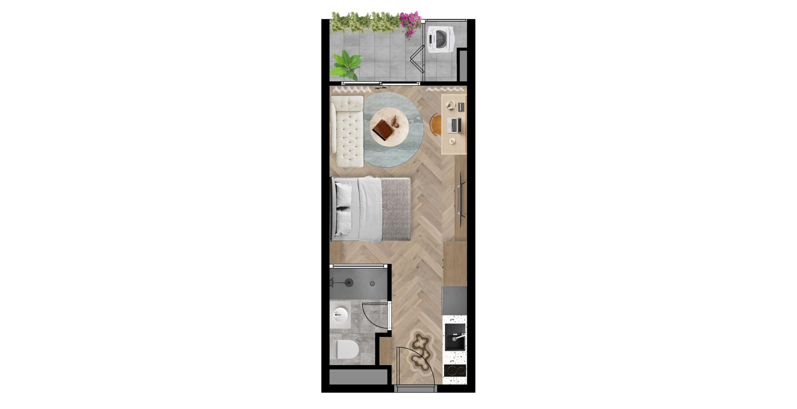 Thiết kế tối giản, không gian mở thông minh giúp tối đa hóa diện tích 32m². Tích hợp đầy đủ khu bếp, phòng khách, giường ngủ và logia thoáng sáng trong cùng một mặt bằng.