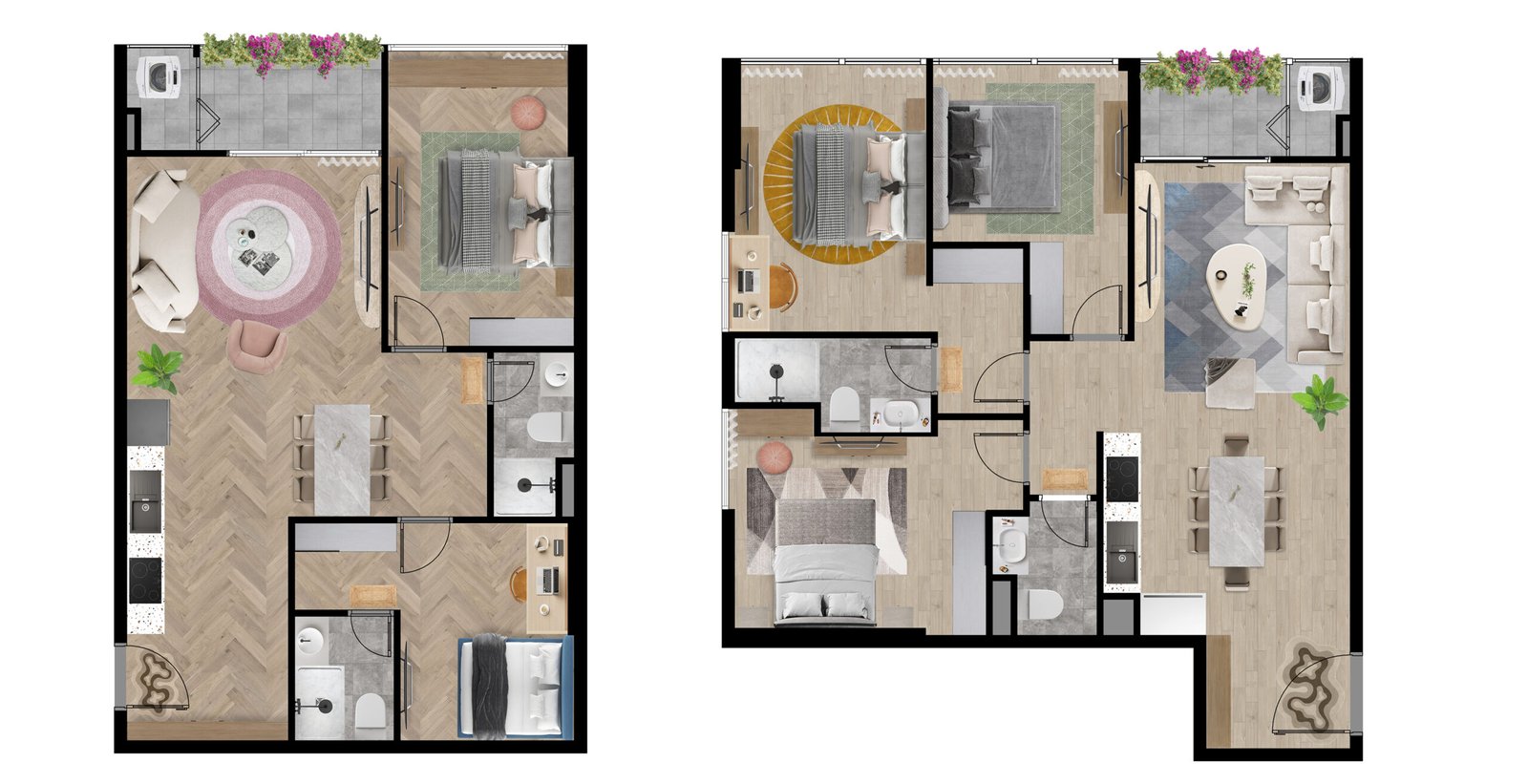 Không gian gồm 2 phòng ngủ riêng biệt, phòng khách thoáng mở liên thông bếp & logia.