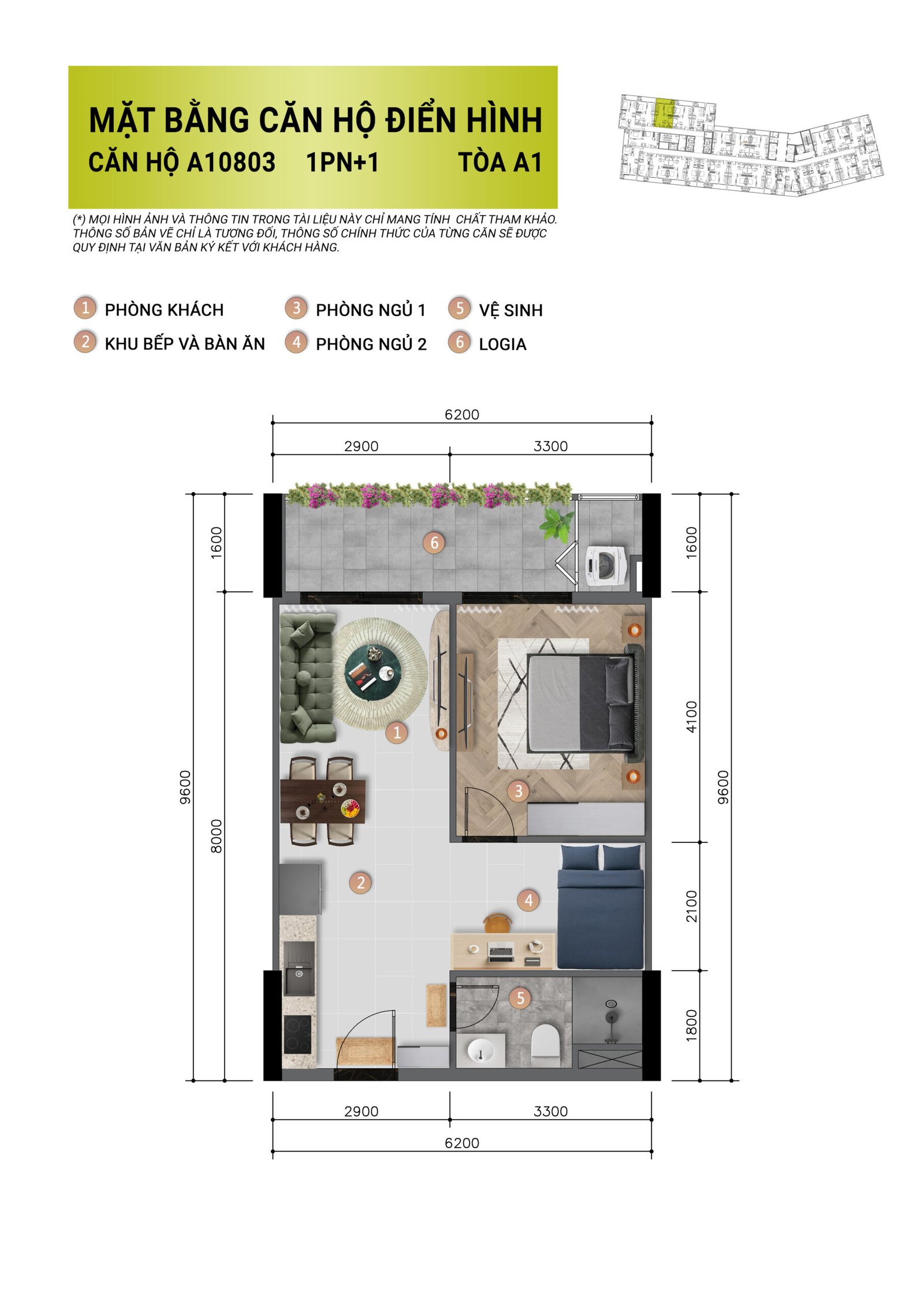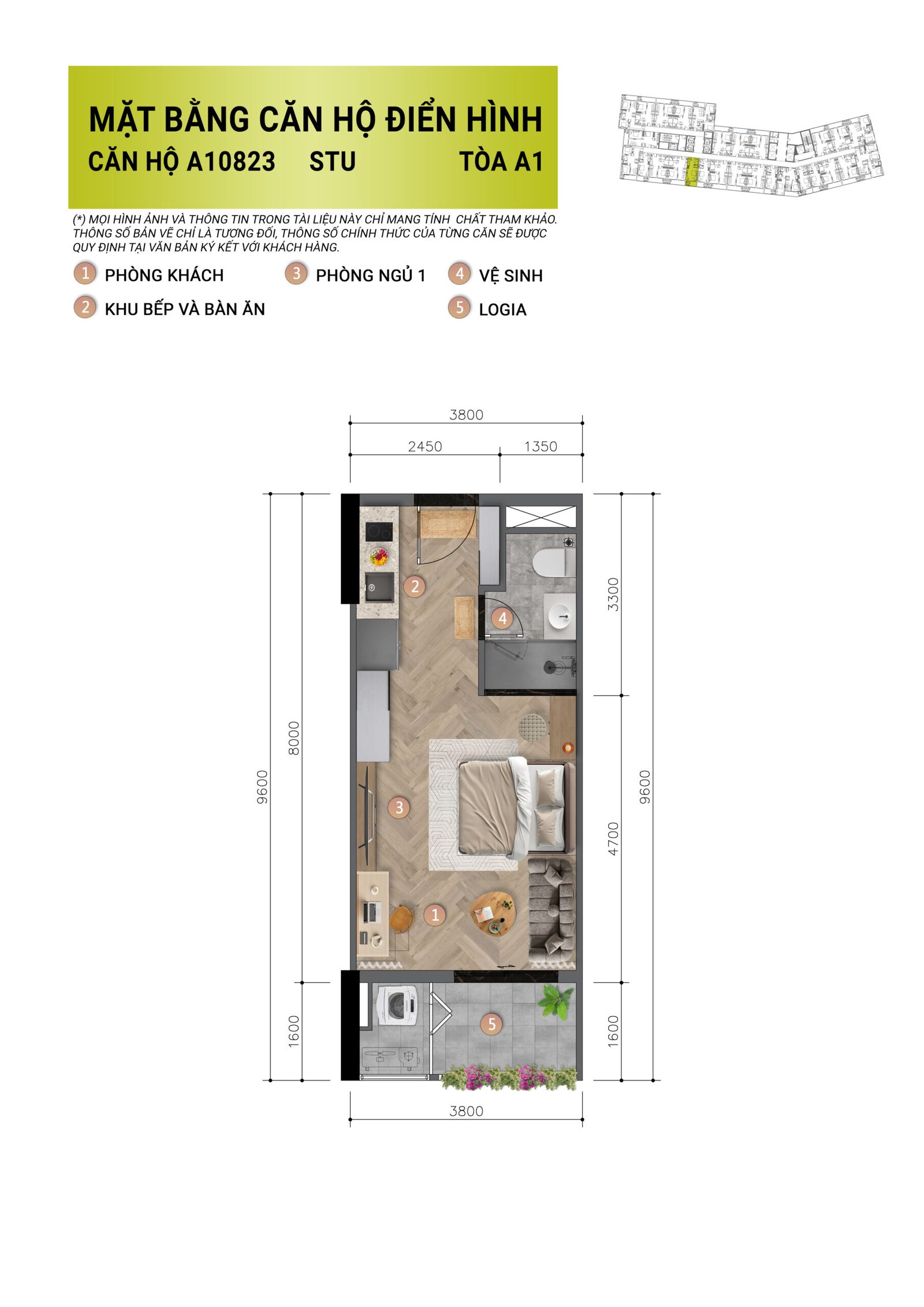 Thiết kế tối giản, không gian mở thông minh giúp tối đa hóa diện tích 32m². Tích hợp đầy đủ khu bếp, phòng khách, giường ngủ và logia thoáng sáng trong cùng một mặt bằng.